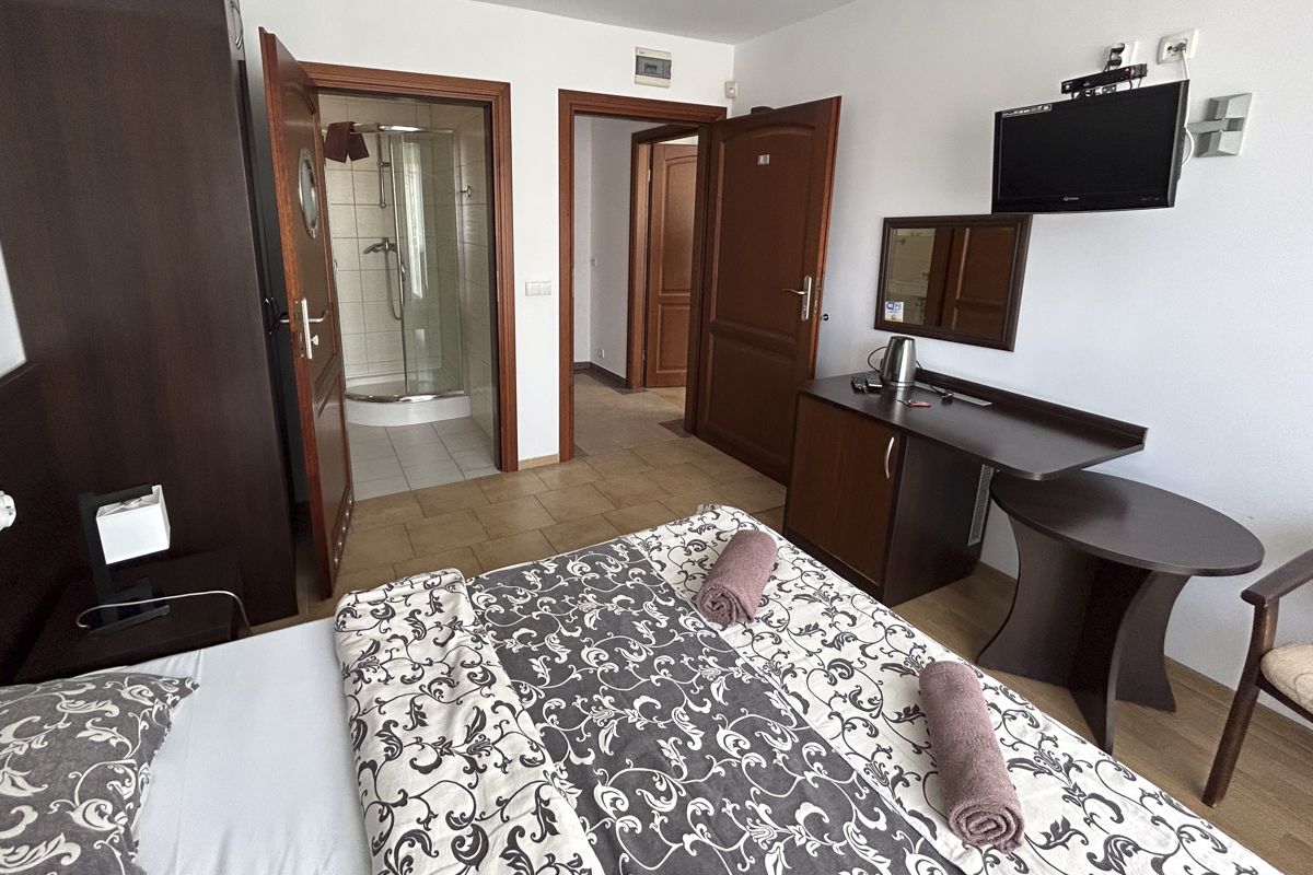 Komfortowy pokój dwuosobowy typu Komfort idealnie sprawdzi się dla par podczas nadmorskiego wypoczynku. Pokój wyposażony jest w wi-fi, TV, lodówkę, czajnik oraz łazienkę, w skład której wchodzi kabina prysznicowa. W obiekcie znajduje się ogólnodostępny, w pełni wyposażony aneks kuchenny oraz kącik z grami planszowymi i puzzlami. Nasz obiekt akceptuje zwierzęta, za które pobierana jest dodatkowa opłata w wysokości 30zł/noc. Na życzenie gości przybywających z małymi dziećmi do 3 lat zapewniamy wygodne, bezpieczne łóżeczko płatne 30zł/noc. W okresie wakacyjnym (21.06. - 31.08.) parking na terenie obiektu jest płatny 18zł/dobę.