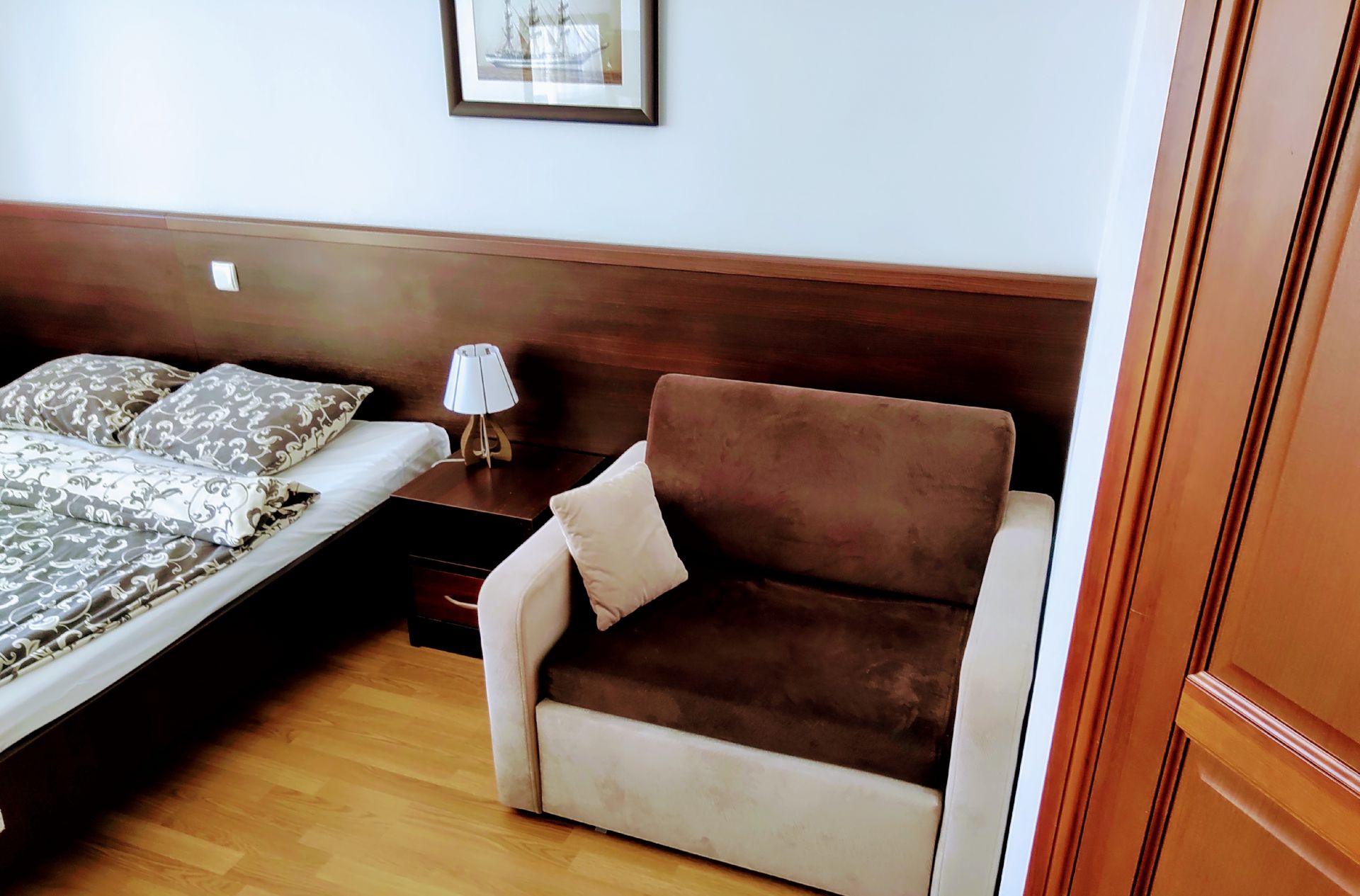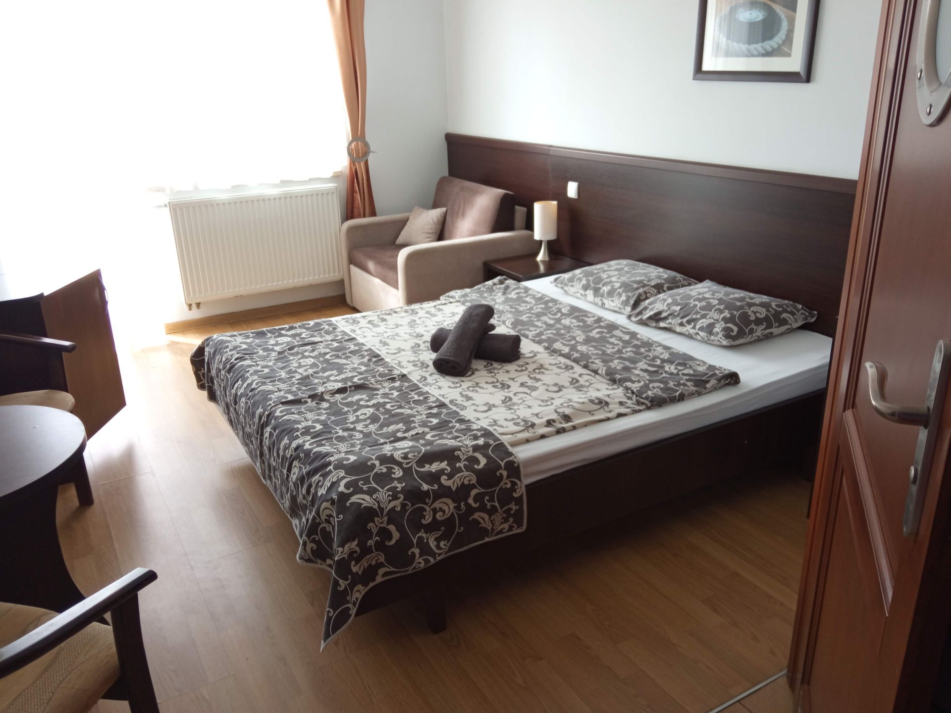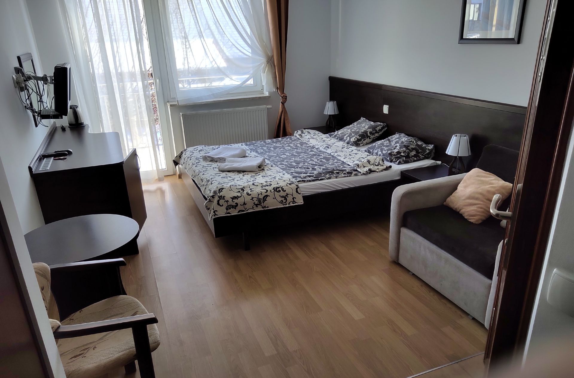 Przytulne studio składa się z dwóch niezależnych pokoi wraz z łazienką. Pokoje połączone są ze sobą korytarzem. Dodatkowo w większym pokoju znajduje się wyjście na balkon. Studio wyposażone jest w wi-fi, TV, lodówkę oraz czajnik. W obiekcie znajduje się ogólnodostępny, w pełni wyposażony aneks kuchenny oraz kącik z grami planszowymi i puzzlami. Nasz obiekt akceptuje zwierzęta, za które pobierana jest dodatkowa opłata w wysokości 30zł/noc.